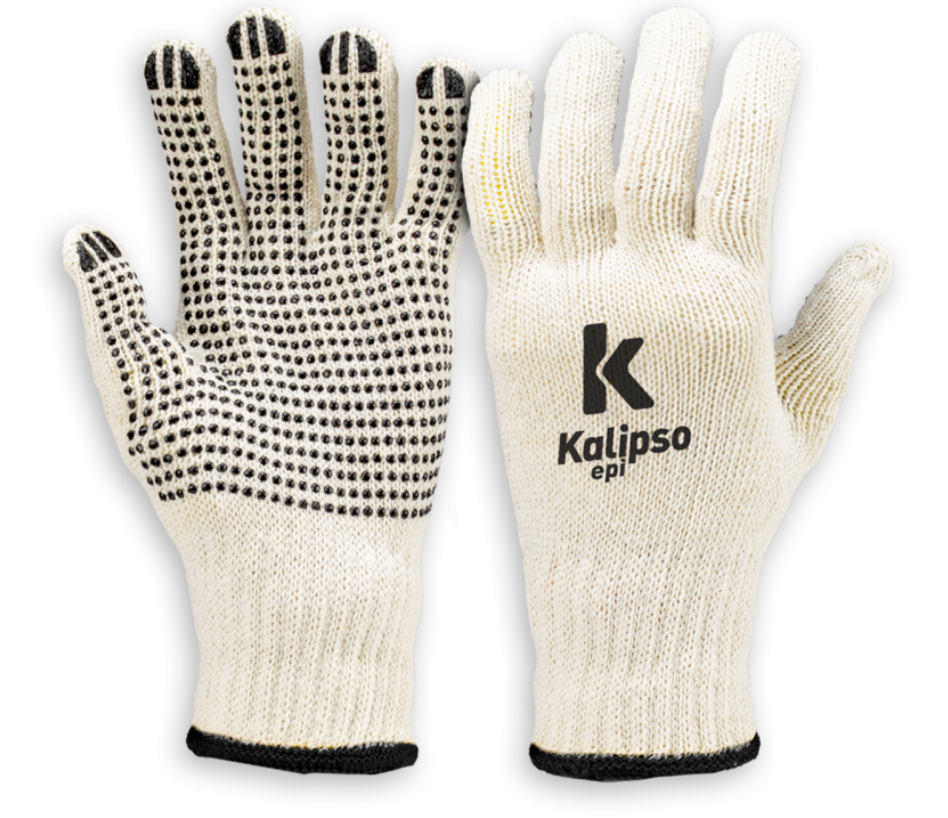 Luva de segurança tricotada em fios de algodão e poliéster, palma e face palmar dos dedos com pigmentos antiderrapantes de PVC, extremidade dos dedos com reforço de borracha de PVC. Punho com elástico, com acabamento em overloque.